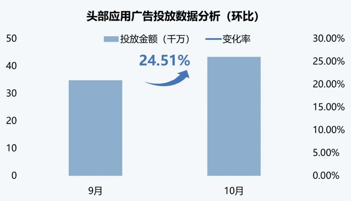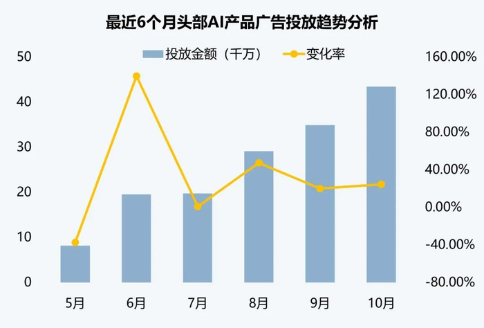 国内头部AI应用广告投放数据,投放金额环比上升24.51%,连续6个月稳步攀升,总金额突破4亿。