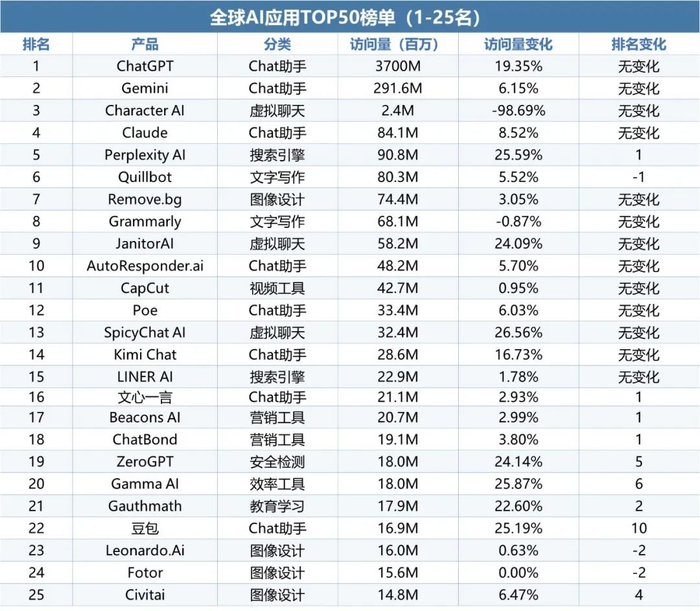 数据说明:本报告中所说的流量,特指Web端访问量,来自于Similarweb,相关产品来自于伽马数据统计的两万+款AI产品