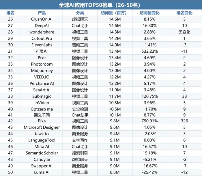 全球AI应用TOP50榜单中,Pika以环比790.91%的增长率,跃升326位至第42名