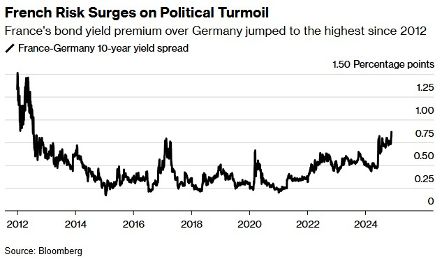 法国政治不确定性加剧,极右翼领导人玛丽娜·勒庞的财政部长表示,国民联盟尚未决定是否对预算的不信任动议进行投票,这可能导致政府垮台。法国总理米歇尔·巴尼耶在推动2025年预算时面临挑战,而国民联盟在谴责投票中扮演关键角色。这一政治动荡使得法国10年期债券与德国债券之间的利差扩大至90个基点,创2012年以来新高,引发投资者对法国政治和金融前景的担忧。