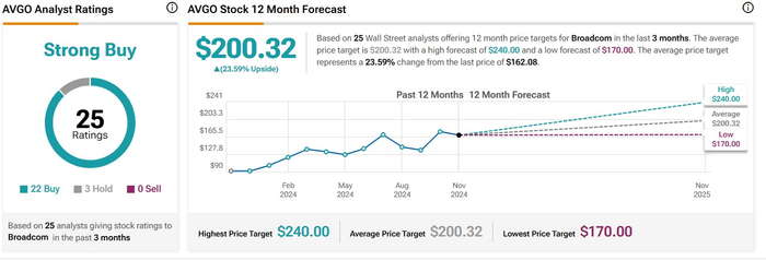 因此,尽管近期股价表现相对疲软,但多数分析师认为投资者无需对博通股价以及业绩前景持悲观态度。TIPRANKS汇编的华尔街分析师评级与目标价显示,博通未来12个月平均目标价高达200美元,共识评级为“买入”,没有出现任何“卖出”评级。其中,Cantor Fitzgerald近期将博通目标价从200美元上调至225美元,瑞穗则将博通目标价从190美元大幅上调至220美元。相比之下,博通股价上周五收于162.08美元。