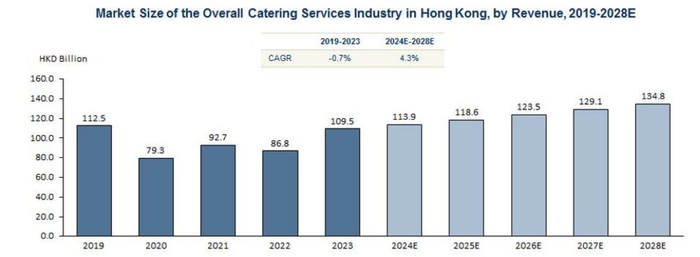 自2023年起,随着边境管制和预防措施的取消,本地需求回升,旅游业恢复,导致香港饮食业强劲复苏。香港饮食业的市场规模在2023年达到1,095亿港元。展望未来,预计香港饮食服务业的整体市场规模将由2024年至2028年达到1348亿港元,每年增长约4.3%个百分点。