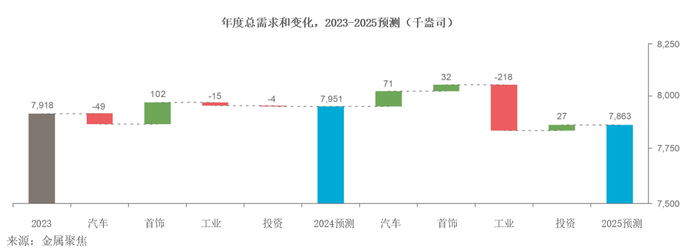预计2025年铂金总需求量将下降8.8万盎司,降至786.3万盎司。虽然预计汽车、首饰和投资需求将增加,但2025年需求将受到工业需求同比下降9%的影响,主要由于新玻璃产能几乎没有增加。