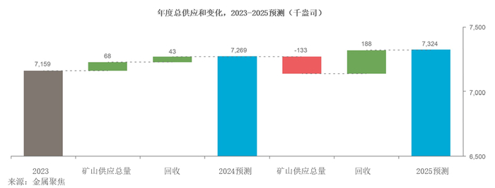 预计2025年铂金供应量将增加5.5万盎司,达到732.4万盎司。汽车催化剂的回收供应量预计将增加17万盎司,达到134.6万盎司,同比增长14%,这将支撑铂金总供应的增长。相反,矿产供应预计在2025年将下降13.3万盎司,同比减少2%,因为南非和北美在2024年的重组影响将开始反映在产量中。