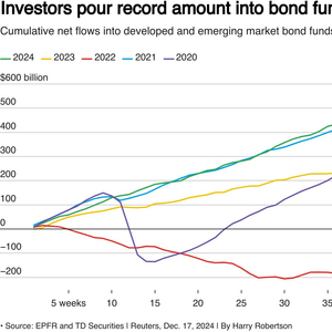 在充满不确定性的2025年到来之前,投资者今年迄今向全球债券基金投入了创纪录的6000亿美元,以利用几十年来最高的一些收益率。根据金融数据提供商EPFR的数据,截至12月中旬,流入发达市场和新兴市场债券基金的资金达到6170亿美元,超过了2021年的5000亿美元,使2024年有望成为创纪录的一年。