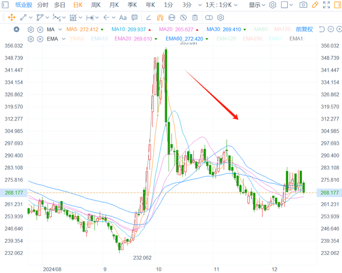 12月16日,港股纸业股板块大幅高开,盘中一度涨超4%,截止收盘,板块整体上涨1.67%。奈何板块上涨的“胜利果实”尚未持续多久,后又被打回原形,12月17日、18日,该板块连续走绿,分别收跌0.16%、2.02%。而拉长时间线来看,自到达年内高点355.097点之后,截止目前纸业股板块已经累跌超23%。