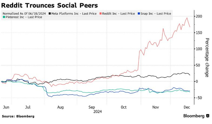 根据摩根士丹利分析师布莱恩·诺瓦克近期发布的研报,过去六个月里,Reddit的股价表现远超Meta及其他社交媒体同行,且在2025年仍有非常宽阔的上涨空间。他于本月早些时候将该股评级上调至“增持”,并表示与AI领军者们达成的训练协议、用户参与度提升和广告举措将继续推动业绩与股价增长。