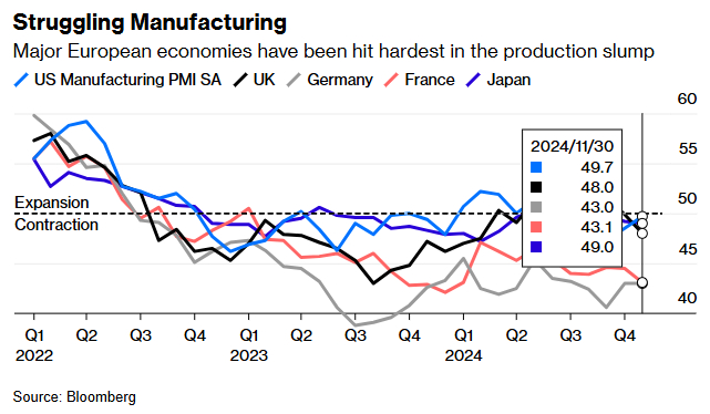 德国和法国是陷入困境最严重的国家,能源成本大幅上涨是主要原因。找到摆脱困境的办法将是欧盟 2025 年的主要任务。