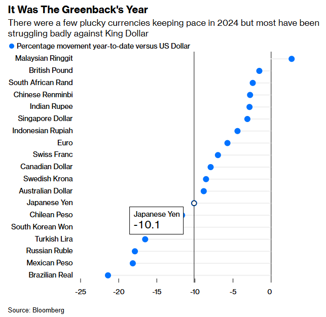 很难知道今年美元的主要驱动因素是什么。这可能是特朗普政府的言论与美联储如何应对之间的激烈较量——这位候任总统既谴责美元走强,又要求金砖国家保持其主导地位。美国进一步降息并非板上钉钉;与此同时,在去年美元指数上涨 6.5% 之后,世界其他国家将不得不照顾好自己。