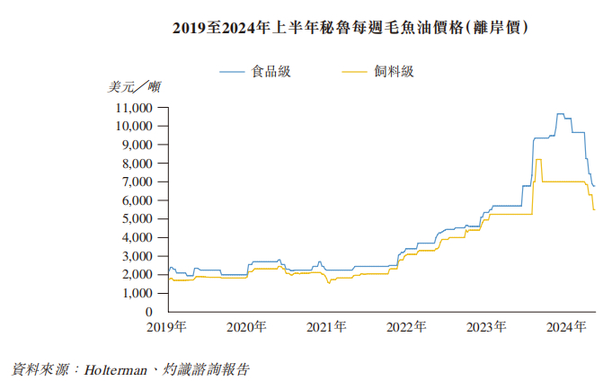 由于秘鲁鳀鱼是鱼油主要来源,因此秘鲁的毛鱼油离岸价变动可以反映毛鱼油全球供应动态的转变。过去几年间,受到多种因素影响,秘鲁的毛鱼油价格呈现出大涨大跌的特征。尤其是在2024年之后,由于厄尔尼诺现象减弱,以及当地政府的捕捞配额增加等因素影响,毛鱼油价格持续大幅下挫。