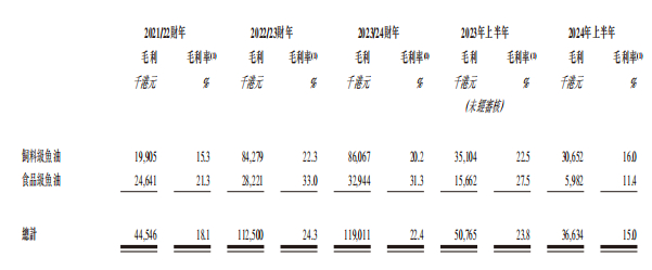 拆分收入结构,高龙海洋的收入基本都来自于饲料级鱼油产品和食品级鱼油产品。2021/22财年-2023/24财年,公司来源于前者的收入占全部收入的比例分别为52.9%、81.6%、80.2%。同期,后者的收入占比分别为47.1%、18.4%、19.8%。2024年上半年,高龙海洋的饲料级鱼油产品贡献收入1.92亿港元,占比78.5%;食品级鱼油产品贡献收入5247.6万港元,占比21.5%。