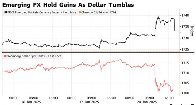 随着特朗普在宣誓就职时没有宣布新的贸易关税,追踪新兴市场货币的一项指标周一也上涨。MSCI新兴市场货币指数盘中攀升0.7%,但尾盘调整后仅上涨0.3%,创下去年9月以来最佳表现。匈牙利福林和波兰兹罗提领先。投资者认为受美国关税影响较大的加元、墨西哥比索分别上涨了至少1%。新兴市场市场也上涨,MSCI新兴市场股指上涨1.2%。