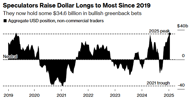 彭博宏观策略师Simon White表示:“与之前的就职典礼相比,在特朗普就职后的几天和几周内,美元是最脆弱的资产。美元表现是与过去平均水平最不一致的,回顾前几届大选和随后的就职典礼期间的资产价格走势,美元表现强劲。让美元更加脆弱的是过度的多头仓位。”