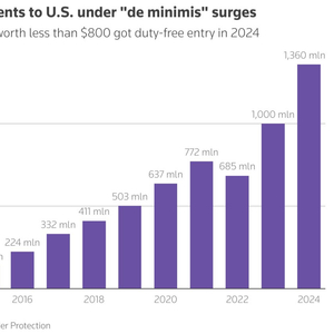 这项规定最初是为了简化贸易,随着网上购物的增加,它的使用激增,推动了快时尚零售商Shein和网上一元店Temu的增长,这两家公司销售的产品从玩具到智能手机都有。