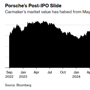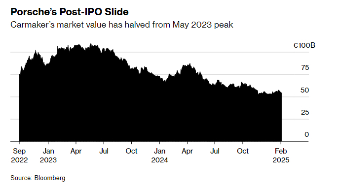 保时捷股价去年下跌27%,这家总部位于德国斯图加特的公司自2022年IPO以来持续下挫。其市值已从2023年5月的1095亿欧元高点减半。