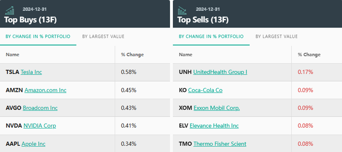 前五大卖出标的包括:联合健康(UNH.US)、可口可乐(KO.US)、埃克森美孚(XOM.US)、Elevance Health Inc.(ELV.US)、赛默飞世尔(TMO.US)。