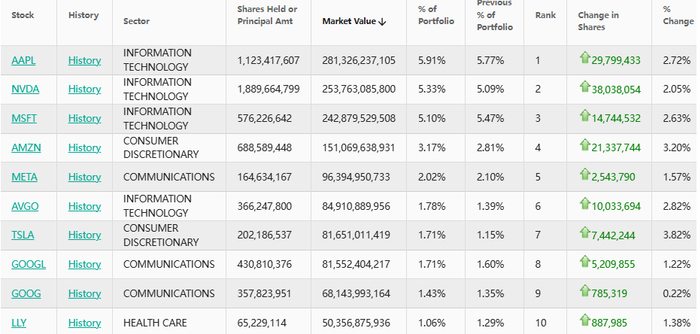 英伟达(NVDA.US)位列第二,持仓18.90亿股,持仓市值约2537.63亿美元,占投资组合比例为5.33%,较上季度持仓数量增长2.05%。