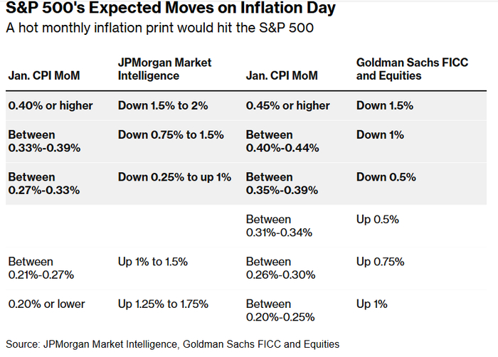 据了解,来自摩根大通的市场情报交易部门最新预测,如果1月份美国整体的消费者价格指数(即CPI)环比上涨0.4%或更多,标普500指数可能下跌2%。如果美国CPI环比增幅等于或者小于0.2%,标普500指数则有可能上涨1%。