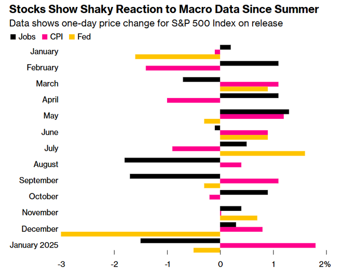 自夏季以来,美国股票市场对宏观数据的反应摇摆不定——数据显示标普500指数在数据发布日的单日价格变化