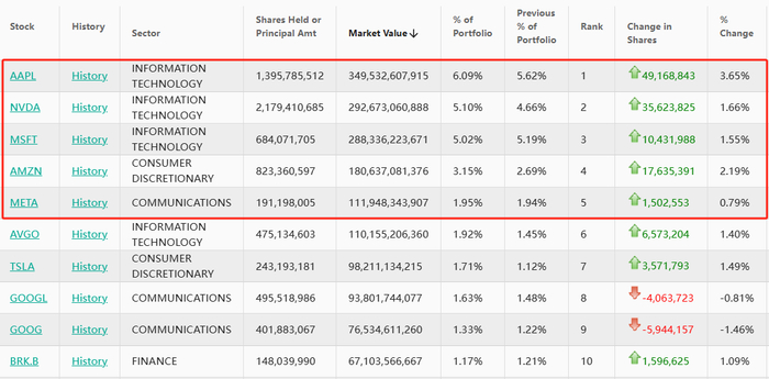 在前五大重仓股中,苹果(AAPL.US)位列第一,持仓约13.96亿股,持仓市值约为3495亿美元,占投资组合比例为6.09%,较上季度的持仓数量增加3.65%。