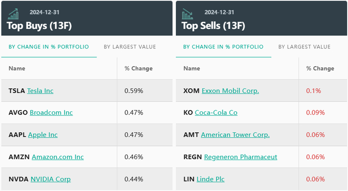 从持仓比例变化来看,前五大买入标的分别是:特斯拉、博通、苹果、亚马逊、英伟达。