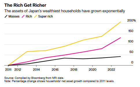 财富差距的不断扩大在很大程度上反映了股票收益的增长,而股票收益通常使高净值家庭受益。报告指出,2023年日元走弱也可能推高了富裕日本家庭所持外国资产的价值。