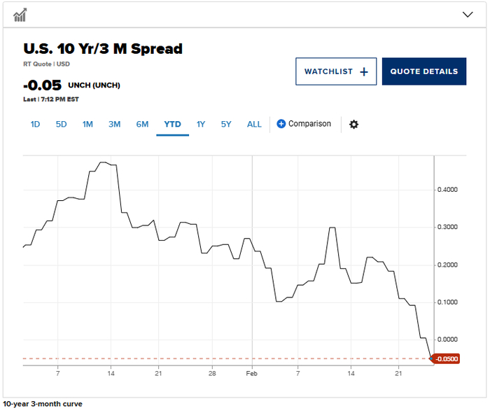典型的衰退预警信号正在美国国债市场闪烁——10年期美国国债收益率低于3个月期美国国债收益率,即所谓的收益率曲线倒挂。在过去几十年里,这一预警信号在预测经济衰退方面(在信号出现后的12-18个月)有着可靠的纪录。