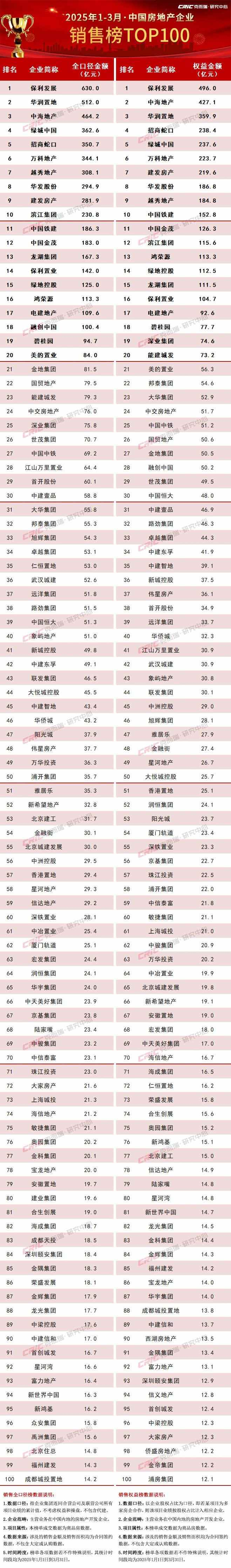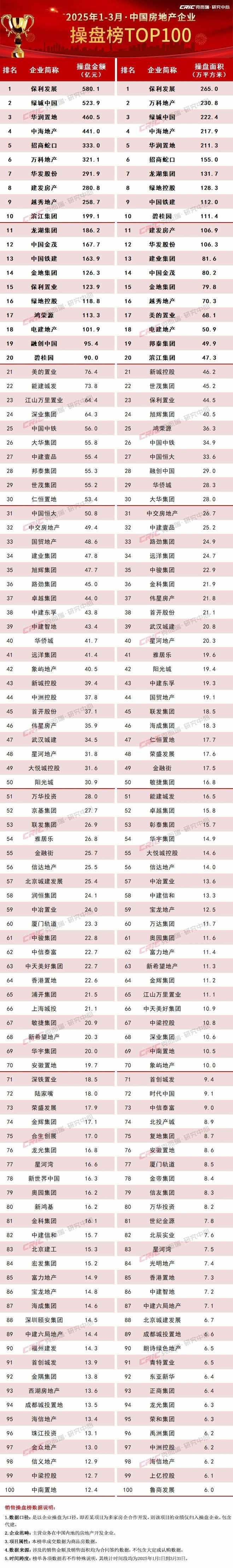 克而瑞地产研究发文称,2025年一季度,中国房地产市场整体保持低位运行,延续止跌回稳态势。3月,TOP100房企实现销售操盘金额3175.7亿元,环比增长68.8%、同比降低11.4%,单月业绩规模保持在历史低位。累计业绩来看,百强房企1-3月实现销售操盘金额7333亿元,同比降低5.9%。