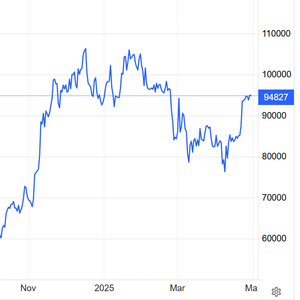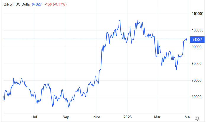 周二亚洲早盘交易,比特币价格交投于9.50万美元附近,虽然4月20日以来大举反弹,但是今年迄今比特币价格走势基本持平,但较一年前上涨51%。
