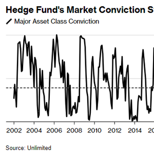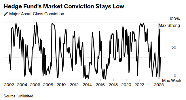 桥水基金前高管Bob Elliott提供的数据显示,所谓的市场信心——对冲基金对推行特定投资策略的信心衡量指标——在跌至近几十年来的最低水平后,目前正在有所恢复。但主要资产类别(包括货币、债券和大宗商品)的持仓情况在3月底跌至2000年以来的最低10%区间后,仍然较为疲弱。