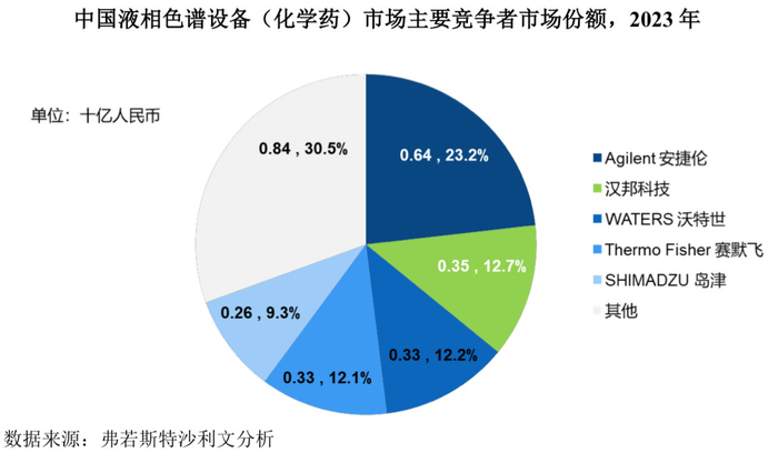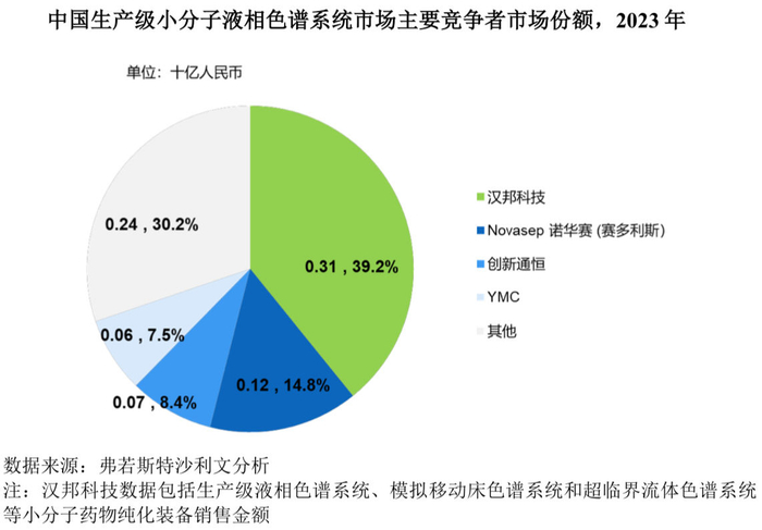 汉邦科技生产的小分子药物分离纯化装备主要为液相色谱设备。小分子液相色谱设备主要可分为实验室仪器和生产级装备两大类,其中国内实验室液相色谱仪市场主要由安捷伦、沃特世、赛默飞等生命科学仪器国际巨头占据。根据沙利文数据,2023 年我国液相色谱设备(包含生产级和实验室级)总规模超过 27 亿元人民币,其中安捷伦占比最高,为 23.2%,汉邦科技凭借在生产级液相色谱分离设备市场的快速增长排名第二,市场份额约12.7%,在国产品牌中名列前茅,沃特世和赛默飞紧随其后。