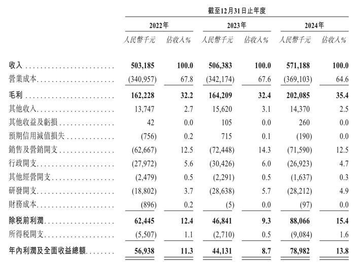 财务方面,于2022年、2023年及2024年,铜师傅的收入分别约为5.03亿元、5.06亿元、5.71亿人民币;同期年内利润分别为5693.8万元、4413.1万元、7898.2万元人民币。