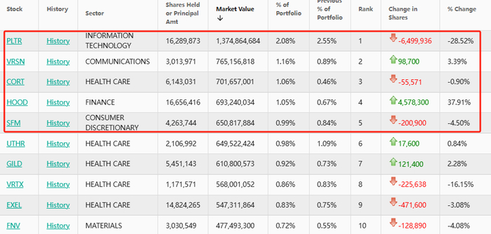 Robinhood(HOOD.US)位列第四,持仓约1666万股,持仓市值约6.93亿美元,占投资组合比例为1.05%,持仓数量较上季度大幅增加37.91%。