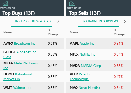 前五大卖出标的分别是:苹果(AAPL.US)、奈飞(NFLX.US)、英伟达(NVDA.US)、Palantir、诺和诺德(NVO.US)。