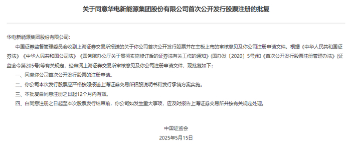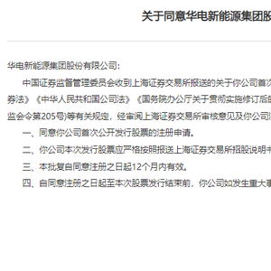 证监会同意华电新能上交所主板IPO注册