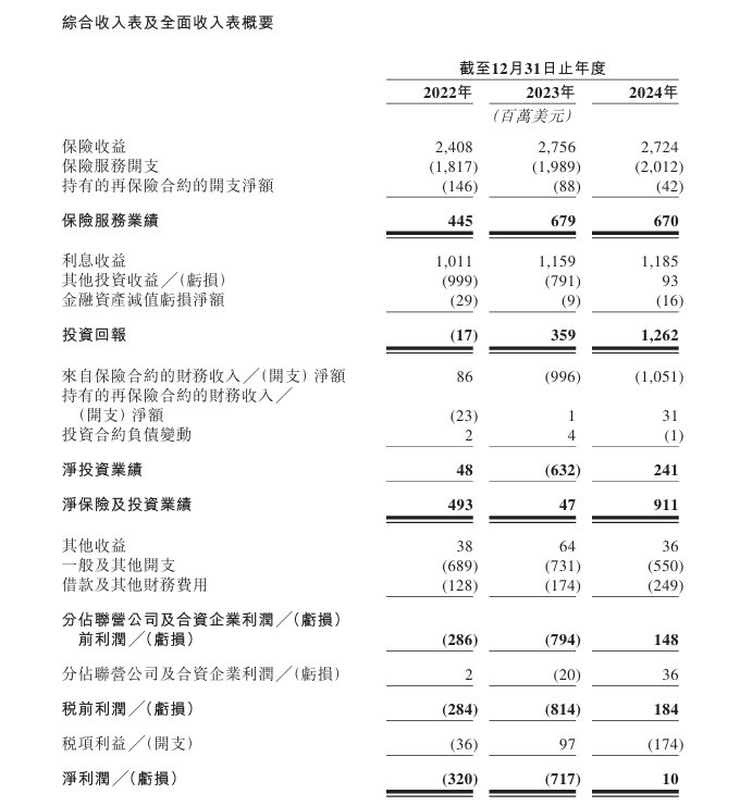 财务方面,于2022年度、2023年度、2024年度,富卫集团实现净保险及投资业绩分别为4.93亿美元、4700万美元、9.11亿美元;同期,净利润分别为-3.2亿美元、-7.17亿美元、1000万美元。