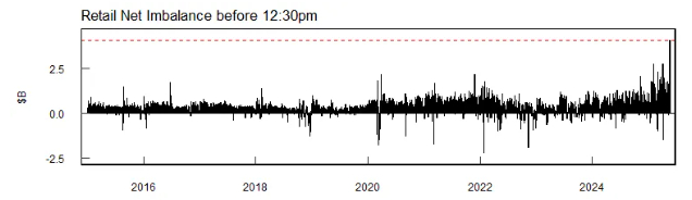 上周晚些时候,穆迪下调了美国信用评级,导致标普500指数下跌1%,本周一,零售交易员开始创纪录地大举逢低买入美股。根据摩根大通量化和衍生品策略师Emma Wu编制的数据,截至美东时间中午12:30,个人投资者净购买了41亿美元的美国股票,这是当天同一时间的最高水平,并且在周一中午首次突破40亿美元的门槛。