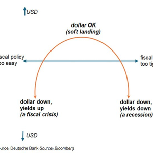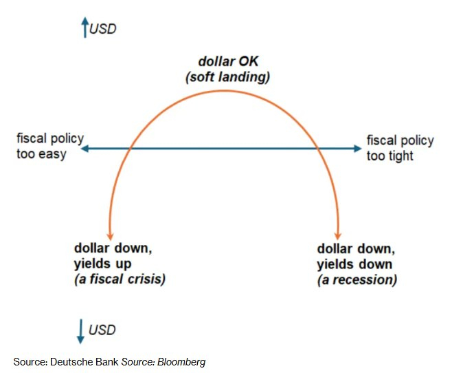 George Saravelos表示,即将到来的预算谈判将决定美元在该曲线上的位置。他表示:“在左侧的极端情境是财政立场过于宽松,这会导致美国国债和美元双双下跌——正如我们今天早上再次看到的那样。”“在右侧的另一个极端是财政立场收紧过快,虽然能迅速缩小赤字,但会迫使美国陷入衰退,并进入深度的美联储宽松周期。”他补充称,一个中间路线,也就是“软着陆”,则对美元更为有利。