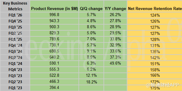 第一财季产品营收同比增长26%,至9.968亿美元,而分析师平均预期为9.66亿美元;剩余履约义务(另一个衡量增长的关键指标)为67亿美元,高于分析师平均预期的约65.7亿美元。
