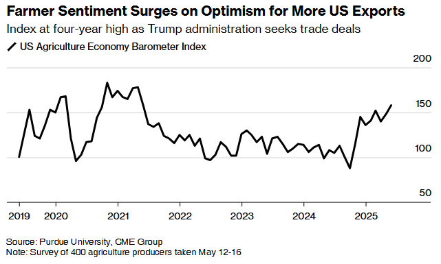 特朗普政府发起的贸易战对美国的农作物出口造成了打击。最大的大宗商品买家中国目前在下一个销售季尚未订购任何美国玉米、大豆或小麦。尽管如此,根据普渡大学与芝加哥商品交易所集团联合发布的农业经济晴雨表显示,农民情绪正趋向乐观。这项在5月12日至16日之间——特朗普政府宣布与中国在贸易协议方面“取得重大进展”后——展开的调查访问了约400位农民。调查结果显示,该指数录得158点,为2021年以来最高水平。