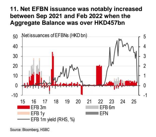是的,如果香港金管局增加外汇基金票据和债券(EFBN)的净发行量以吸收总结余。上一次发生这种情况是在 2021 年 9 月至 2022 年 2 月(图表 11),当时总结余更高(4570 亿港元),美元和港元利率都接近 0%,美元兑港元在 7.80 左右波动。汇丰利率策略认为目前没有必要这样做。