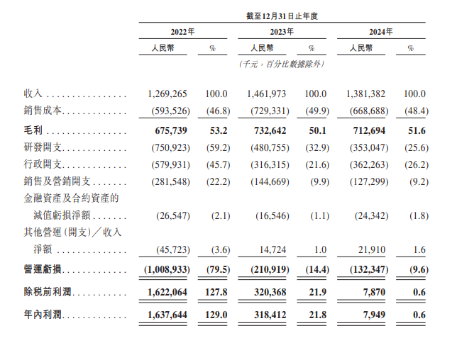 财务方面,于2022年、2023年及2024年,毛利率分别为53.2%、50.1%及51.6%。于2022年、2023年及2024年,研发开支分别为人民币7.51亿元、人民币4.8亿元及人民币3.53亿元。于2022年、2023年及2024年录得净利润16.38亿元、3.18亿元、794.9万元人民币。净利润主要受于2022年、2023年及2024年与本公司价值相关的优先股、认股权证及可换股票据的公允价值变动分别为人民币28.154亿元、人民币5.855亿元及人民币1.86亿元所推动。截至2022年、2023年及2024年12月31日止年度,公司产生的经调整亏损净额(非香港财务报告准则计量)分别为人民币10.987亿元、人民币1.741亿元及人民币4510万元。