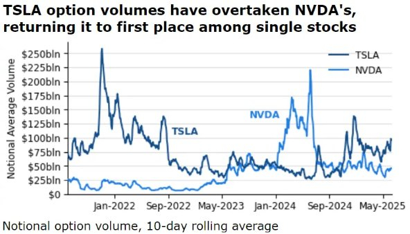 因此,特斯拉的隐含波动率(即对未来市场波动的预期指标)为 65%,是标普500 指数中前 300 只股票中最高的。Asym 500创始人Rocky Fishman表示,该公司的期权交易量已经超过了英伟达公司。