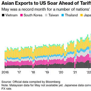 5月份,越南和泰国对美出口均同比增长35%,而台湾对美出口飙升近90%。这些创纪录的增长可能在本周美国公布5月份数据时开始显现出来,并可能使特朗普与亚洲各经济体之间围绕美国将设定的关税水平的谈判复杂化。