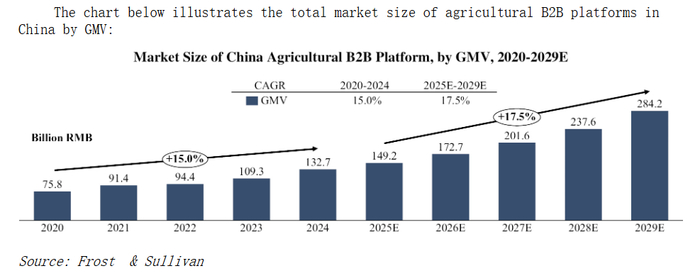 据弗若斯特沙利文数据显示,农业B2B平台的交易量在过去几年中实现了大幅增长,2024年,中国农业B2B平台的商品交易总额(GMV)达到了1327亿元人民币,与2020年的水平相比,复合年增长率(CAGR)为15.0%。