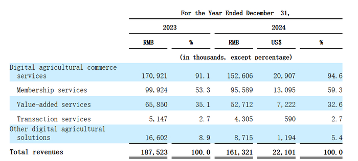 显然,数字农业商贸服务是一亩田收入的绝对大头,而该业务主要包括了会员服务、增值服务、交易服务三个类别,2024年时,这三大服务类别的收入占比分别为59.3%、32.6%、2.7%,交易服务收入相对较小。