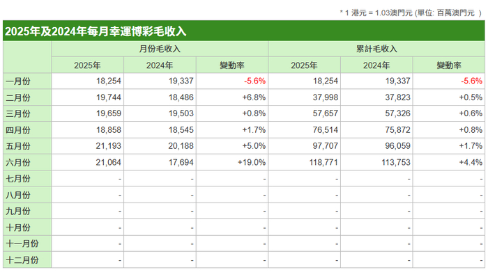 7月1日,澳门博彩监察协调局公布,今年6月份澳门幸运博彩毛收入210.64亿澳门元,同比升19%。今年前6个月澳门博彩毛收入累计达1187.71亿澳门元,同比升4.4%。