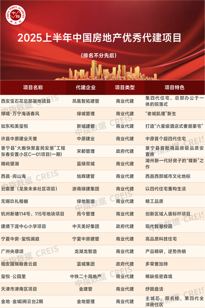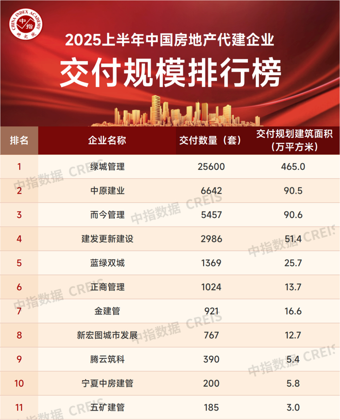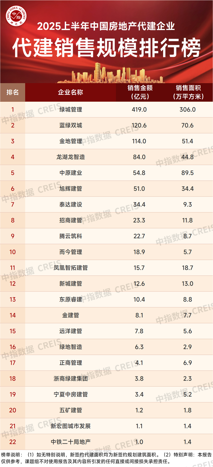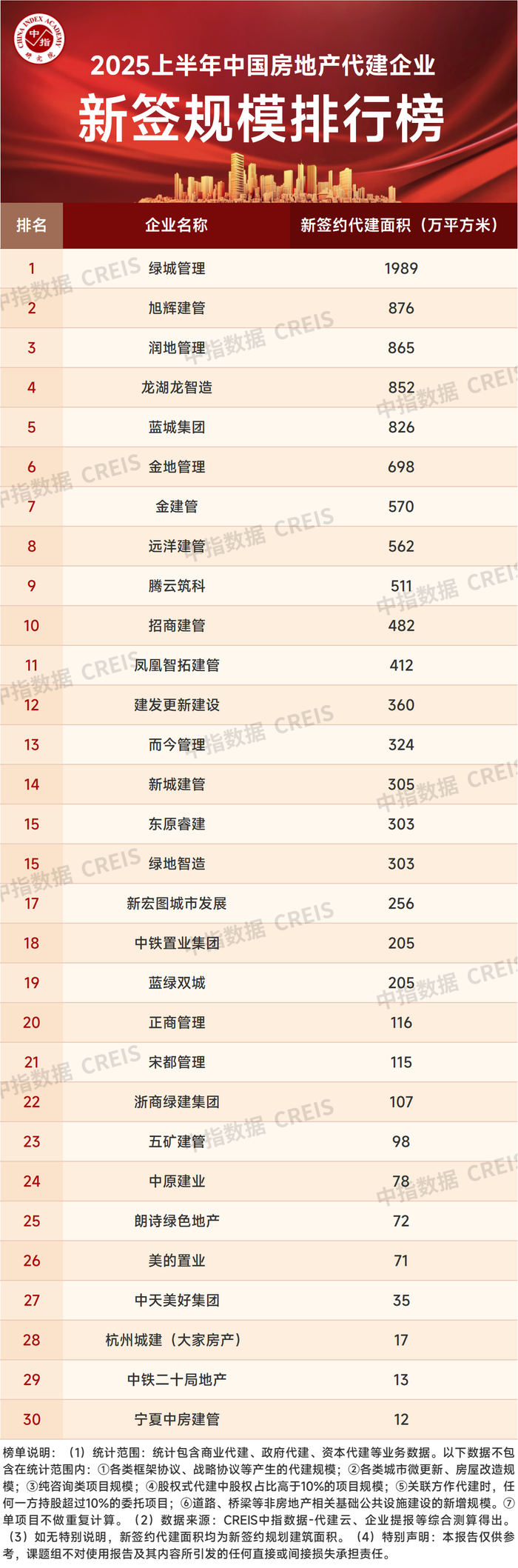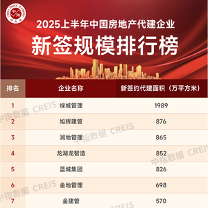 2025上半年中国房地产代建企业排行榜发布 绿城管理以1989万平方米新签约规模位列第一
