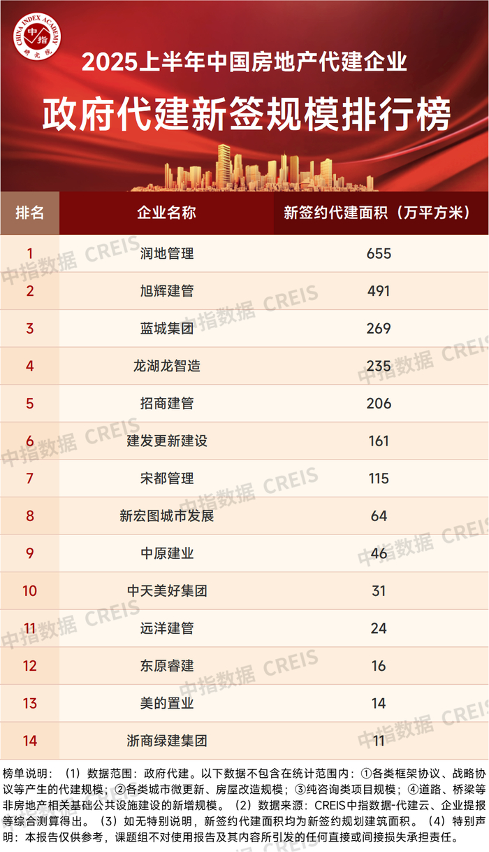 2025上半年,房地产代建企业积极布局政府代建,从榜单来看,润地管理以655万平方米的新拓面积位列榜单第一。润地管理以“6+2”的全产品线布局积极开拓市场,依托服务政府公服领域的丰富经验,半年度中标多个重大项目,行业领先优势持续保持。旭辉建管和蓝城集团位列二、三位,新签约政府代建规模分别为491万平方米和269万平方米。2025上半年,代建企业在政府代建方面主要以保障房、学校、体育场馆等为主,部分企业也在探索城市更新中的代建机遇。
