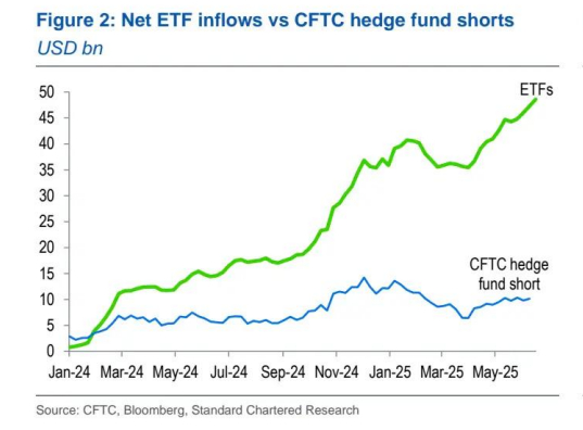 图 2:ETF 净流入与商品期货交易委员会(CFTC)对冲基金空头头寸(十亿美元)